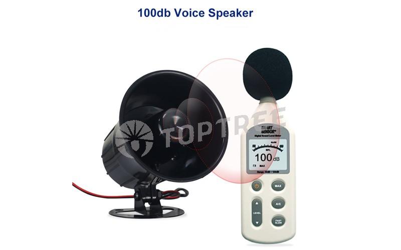 The system outputs approximately 110 dB via an external loudspeaker, making it suitable for noisy industrial environments.